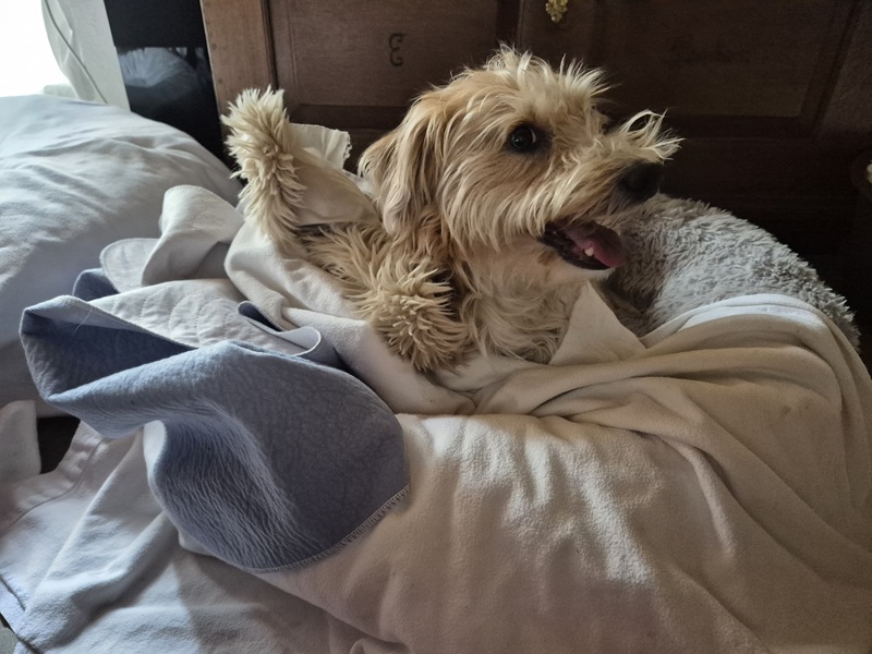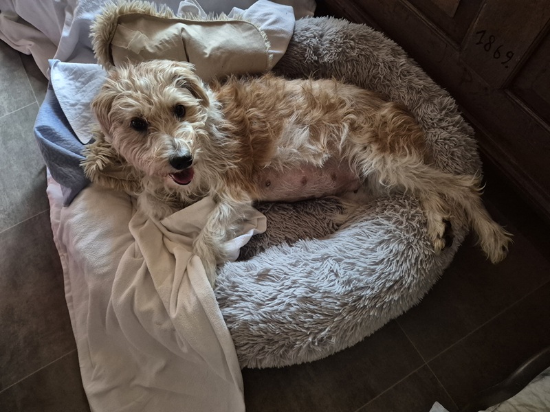 Bereits am Abend des 17.04.2026 wurde Ayka unruhig, hechelte immer wieder und machte sich an den Nestbau in den diversen Hundelagerstätten. Die Körpertemperatur, die wir ab zwei Wochen vor dem errechneten Geburtstermin täglich gemessen haben, war bereits um 0,5 °C abgefallen. Die Nacht auf den 18.04.2026 war ruhelos. Am Morgen des 18.04.2026, am 60. Trächtigkeitstag, fiel Ayka’s Körpertemperatur auf 36,4 °C – ein Indiz dafür, dass der Geburtsprozess in den nächsten 6 – 12 Stunden starten würde.